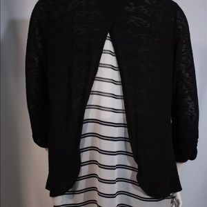 There’s a high-low effect with the back splitting to reveal a striped “under shirt” though it’s attached.