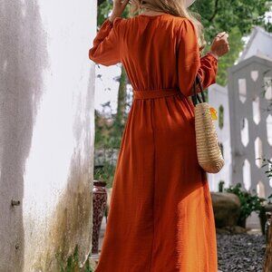 Burnt Orange Boho Womens Ruffle Trim Wrap Belted Dress