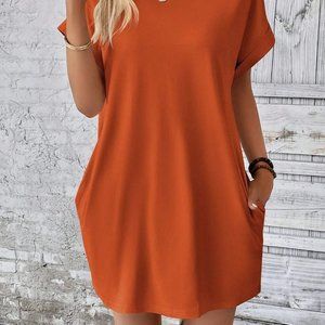 Burnt Orange Boho Womens Solid Batwing Sleeve Hidden Pocket Tee Dress