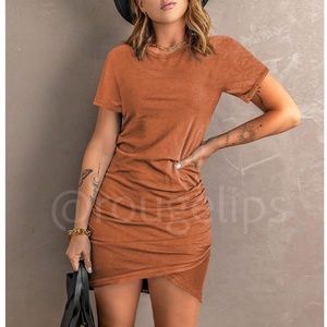 Burnt Orange Mini Tee Shirt Style Dress Casual Ruched Overlapping Skirt Hem
