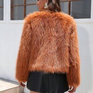 Burnt Orange Preppy Womens Solid Open Front Fuzzy Coat