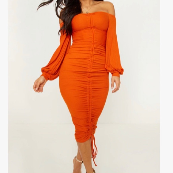 Burnt Orange Ribbed Balloon Sleeve Ruched