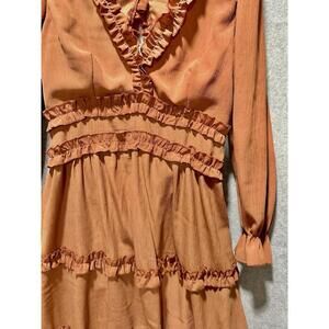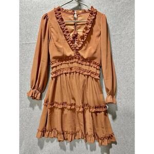 This Burnt Orange Ruffle Short Dress in size Small is a stylish and versatile option for various occasions. With a V-neckline, puff sleeves, and ruffle accents, this dress exudes a feminine and trendy vibe. Made from polyester fabric with a rayon texture, it is perfect for both casual and formal events during the summer and spring seasons. The dress features a button closure and falls under the Fit & Flare and A-Line styles, making it a flattering choice for any woman looking to make a statement with their outfit.