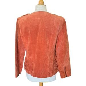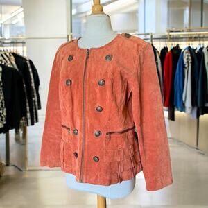 Burnt Orange Suede Leather Jacket w Ruffles & Large Buttons by Prosper & Devine