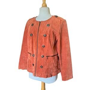 Fabulous Burnt Orange Suede Leather Full Zip Jacket with a Ruffled Hem & Large Decor Buttons by Prosper & Devine. Front pockets. Sleeves Zip. Interior Lining is a gorgeous Cheetah Animal Print. Labeled a size large.