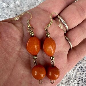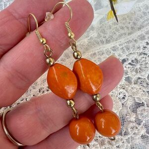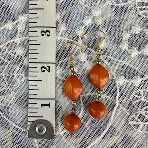 Long dangle earrings in a burnt orange color with gold tone findings.