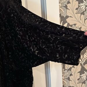 Beautiful black burnt velvet/velour wrap by the Muses lounge. Features Dolman sleeve, three-quarter length. Front length is: 35 inches. Back center length is 30 inches. Never worn.