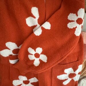 Burnt orange w/white daisies puff sleeve long cardigan, size large. Worn once, in great condition. 36.5” long from shoulder to bottom hem. Super cozy!