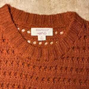 Rhapsody burnt orange crocheted sweater. Gently worn and in good condition. Size M