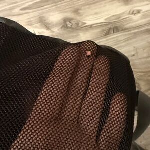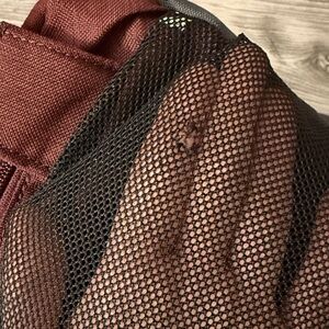 Burton Backpack, Burgunday, large enough to fit laptop/notebooks/binders/folders, padded laptop sleeve, tablet sleeve, small padded tech pocket on top front of bag. Skateboard straps on the front. Some holes in the 2 side mesh water bottle pockets from keys as shown in photos. No other flaws!