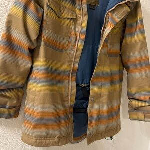 Boys Burton jacket with Dryride technology. One major flaw is that there is no zipper, but it has a Velcro closure. One small dark spot on the front, but otherwise very good condition.
