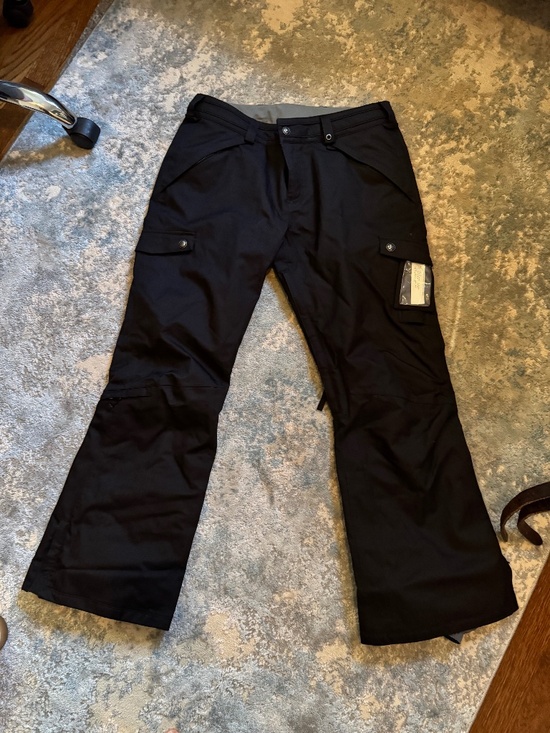 Burton snowboard pants, warmer than my other pair of burtons, worn maybe twice, large pockets, zippers for air at inner thigh and down at ankle for boots, elastic inner liner at ankle to keep snow out