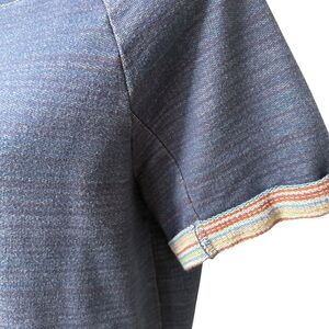 Navy sweatshirt with colorful striped sleeve edges. Comfortable and casual style.