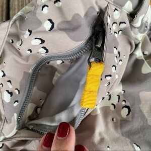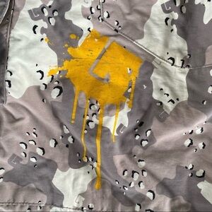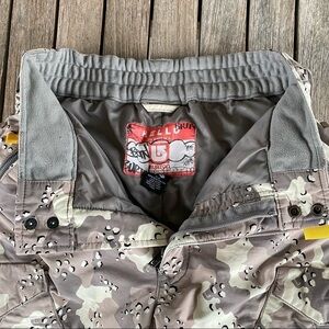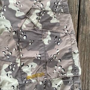 Burton Camo Camouflage Insulated Snowboard Ski Pants-Youth Size XS 5-6. Gray and Tan Camouflage with Yellow accents. Elastic waist, zip closure. Elastic cuffs help keep the cold out. Plenty of secure pockets with zip an Velcro closure. These are heavier weight, warm, quality snow pants in great preowned condition. They have a small stain on the front (see last pic) which is hard to see. Tons of adventure left!