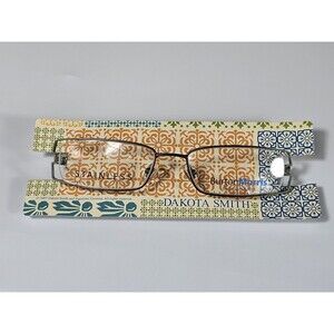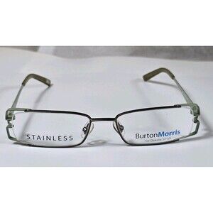 Elevate your eyewear style with these Burton Morris for Dakota Smith eyeglass frames. Featuring a sleek Art Deco-inspired design with an olive green stainless steel frame, these unisex frames offer a modern yet timeless look.