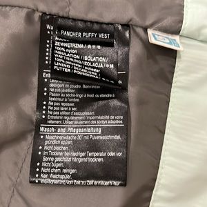 Burton Rancher Puffy Vest. Light sea foam color. Zippers and buttons all work. The removable hood is missing.