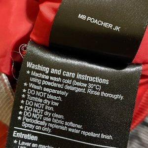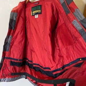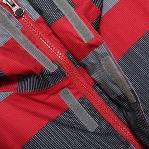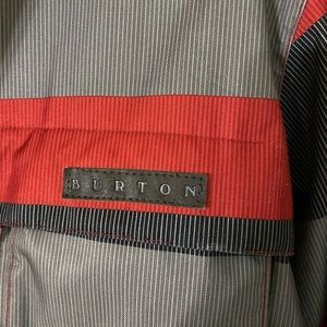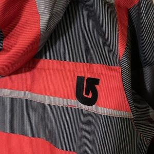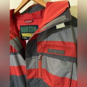 Stylish Burton ski jacket. Red and gray stripes. Perfect for snowboarding. Easy to spot on the slopes.