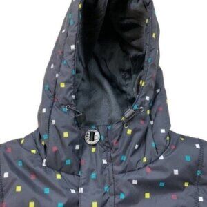 The color of the vest is Black with colored Polka Squares, adding a playful and fashionable touch to your winter wardrobe.