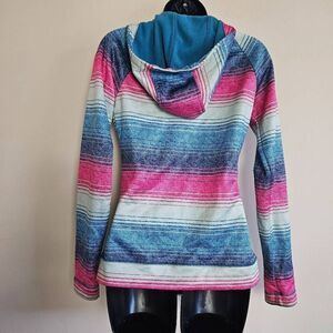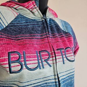 The Burton WB Peak Colombo jacket shown in the images is a colorful, full-zip hoodie with a bold striped pattern in shades of pink, blue, and white. The front of the jacket features an embroidered "BURTON" logo in large, dark blue lettering across the chest. It has two front pockets, as shown in the pictures, and is lined with blue fleece fabric. The fit is feminine, tailored slightly at the waist for a flattering silhouette, with long sleeves and a comfortable, relaxed style, making it a suitable choice for outdoor activities or casual wear.