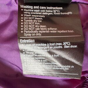 Hooded full zipper ski snowboard jacket coat. Shade of coral / orange. Inner purple lining. Pockets all over. Ventilation zippers under arms. See photos for materials.