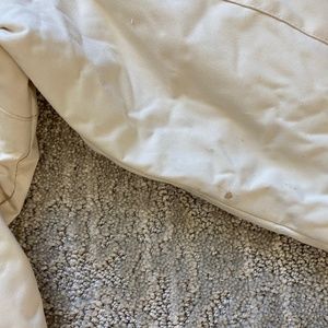There are a few small stains as seen in photos. They may come out with a stain remover but I have not tried. This jacket has a lot of life left in it!