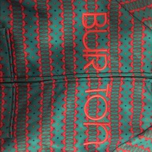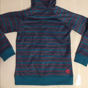 This is a burton flamingo sweatshirt, the flamingos are pink and he rest of the sweatshirt is blue. This has the thumb holes. This is great for under snow gear. This is a zip up sweatshirt.