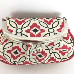 • Small canvas kiss lock, bag, red and black, floral print on a cream colored background. Red interior, with a built in mirror inside.