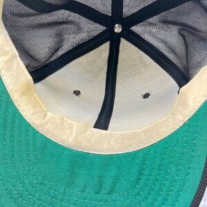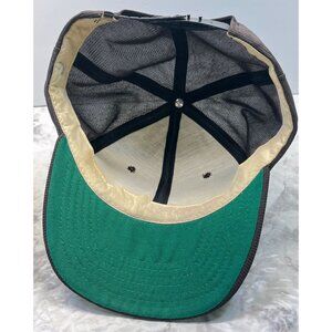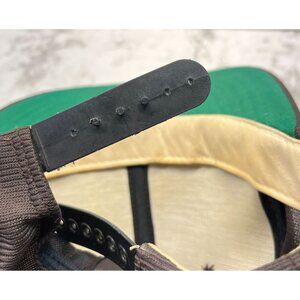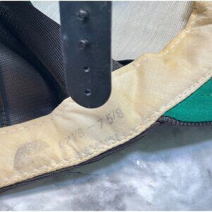 Hat is in fair condition with stains on interior and sweatband. Snap strap is damaged and only has 3 pegs left. Strap could be replaced.