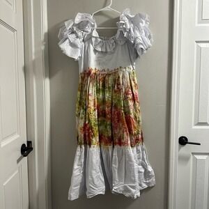 Busayo's Folake dress is a midi-style with a ruffled empire-waist silhouette. This piece boasts convenient side pockets with a ruffled neckline and a tie-dyed print.