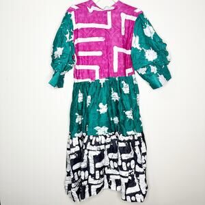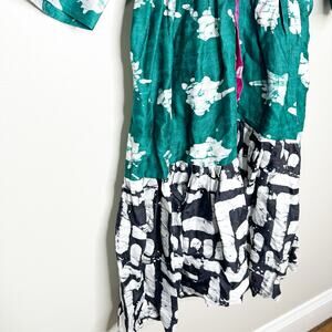 Busayo Tayo Mixed Batik Print Tie Dye Cotton Midi Puff Sleeve Dress Large