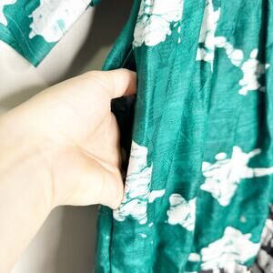 Style Notes: midi length, puff sleeve, tie dye, pink teal black color way, has pockets, v neck