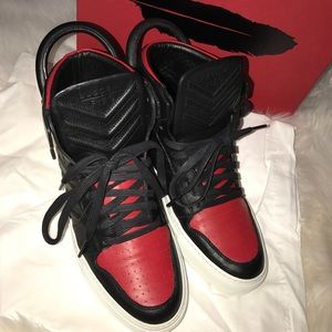Men's black and red leather Ronnie Fieg for Buscemi 110mm Fieg round-toe high-top sneakers with tonal stitching, pull tabs at counters featuring pad lock, keys and clochette, rubber soles and lace-up closure at uppers. Includes box and dust bag. ☄️Euro (38) fits a women's (7.5) “☄️