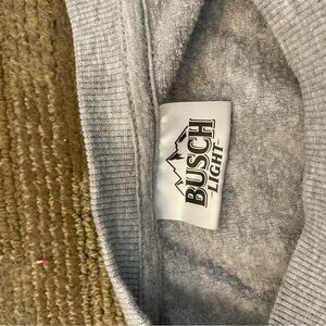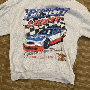 Gray sweatshirt featuring a Busch Light racing graphic with a car and checkered flag. Only work once!