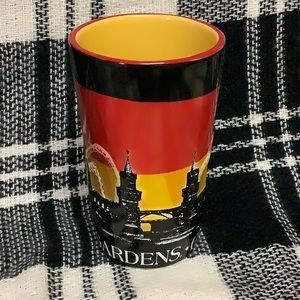 Busch Gardens Germany coffee mug. Tall textured mug. Graphics of roller coasters over the colors of Germany's flag. Busch Gardens Germany across the bottom in white. No chips or cracks. Busch gardens official merchandise.