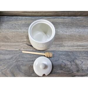 Bushwick Kitchen Honeypot Jar White Ceramic w/ Lid & Wooden Dipper 14 oz. Condition is New. Weight is 1Pound 4.7oz.