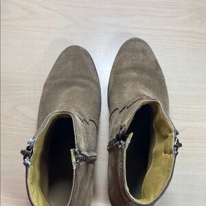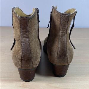 Chic brown suede ankle boots by Bussola. Features side zippers for easy wear and western style seams. Stylish and versatile. Pair with a sundress for a boho look or denim and a plaid shirt for a rodeo aesthetic.