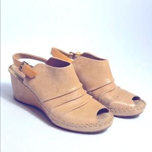 Bussola peep toe wedges in a light tan color with a golden strap.