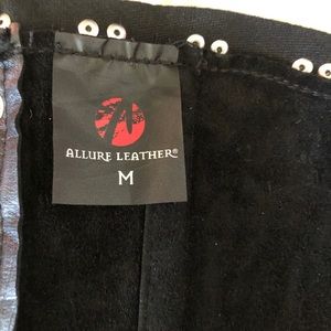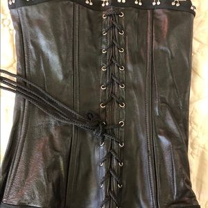 Black leather bustier. Hook and eye closure. Thong Panties never worn. In perfect condition.