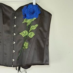 Bustier Corset Plus Size Black Blue Flower Embroidered Lace Up Back Satin Sz XXL. Good pre-owned condition. Gentle signs of wear. No stains, holes or snags. All measurements are approximate.