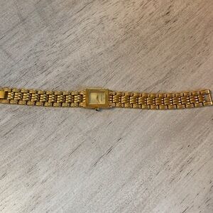 Very old from an estate sale this butchered vintage ladies tank Watch. Gold color quartz. Stainless steel bracelet. From Switzerland. Use for formal occasions everybody will love it on your wrist. 17 mm size thank you for looking at my vintage very old vintage estate sale, jewelry, and free gift to everybody who buys remember, timing is everything