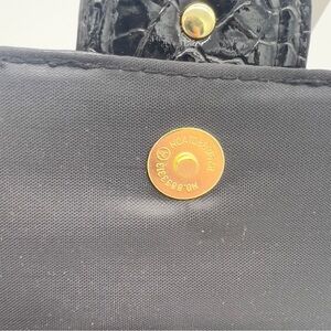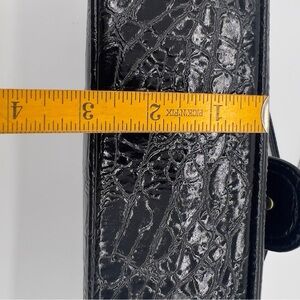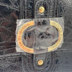 Add a sleek, vintage-inspired touch to your outfit with this Butler Essentials by Jen Grover black shoulder bag featuring a glossy faux crocodile finish and gold-tone buckle detail. Compact yet stylish, it works perfectly as a clutch or evening purse. New without tag—protective plastic still on hardware.