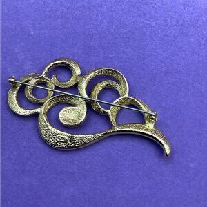 This gold and rhinestones abstract brooch is signed Butler and well made. in very good to mint condition, this brooch is 3 long. Butler was manufactured in the 1980s in Moose Jaw. Saskatchewan.