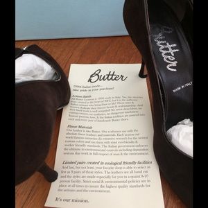 Beautiful brown suede and leather heels by Butter. Made in Italy. Seems visible where leather edge was finished ( shown in 4th photo.) Worn twice; slight wear on soles and sides. Comes in box with Butter Italian made guarantee. Heel height 3".