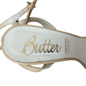Butter Brand neutral beige strappy leather sandal with beautiful rhinestone embellished toe strap. Made in Italy. Adjustable ankle wrap strap. Slight platform for added comfort. Size 6.5- TTS fit.