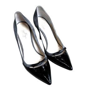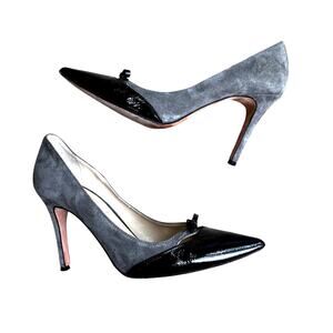 Butter brand US size 8M gray suede & black patent leather high heels - lovely classic pumps - shoes made in Italy with tiny bows across the pointy toes. These are in excellent condition - obvious quality - no damage or flaws - just beautiful!