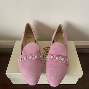 The essential business loafer is finished with Italian suede and fun stud pearl details, that add personality to any look. Sizing: True to size. - Round apron - Stud details - Vamp strap - Suede construction - Slip-on - Approx. 1" Heel Height - Imported