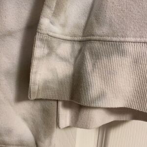 Butter White With Grey tie Dye Sweatshirt. Grey looks a little green. Side slits. Some piling. Made of cotton, polyester and spandex. Size M.