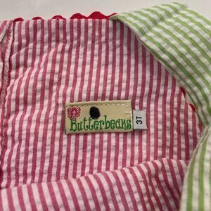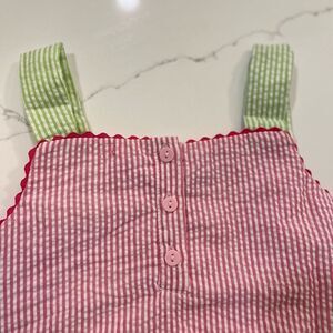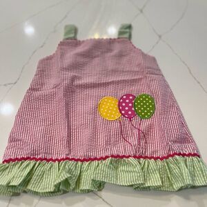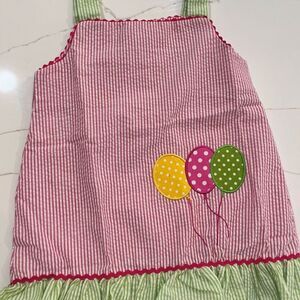 This delightful dress from Butter features a charming pink and green color palette, perfect for any occasion. The dress is adorned with a playful balloon appliqué on the front, adding a whimsical touch. Wide sage green straps and a matching ruffle hem complete the look, making it both stylish and comfortable.