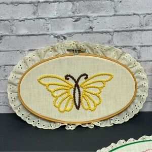 Butterflies Flower Needlepoint Handmade Art Framed Ruffles 3 Pieces Vintage. Good vintage condition. Shows signs of storage/stains due to age. SOLD AS IS. One piece is signed and dated by the artist of these beautiful pieces of art.