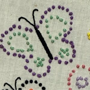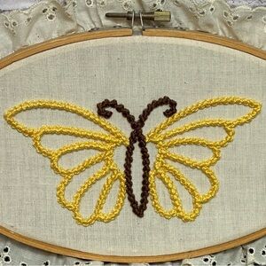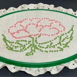 Add some vintage charm to your home décor with this beautiful handmade art piece. Featuring a stunning design of butterflies and flowers, this needlepoint wall hanging is a unique addition to any room. The ruffles add a touch of whimsy, and the three pieces make it easy to mix and match for a personalized look. These pieces are a must-have for any lover of handcrafted and finished art.